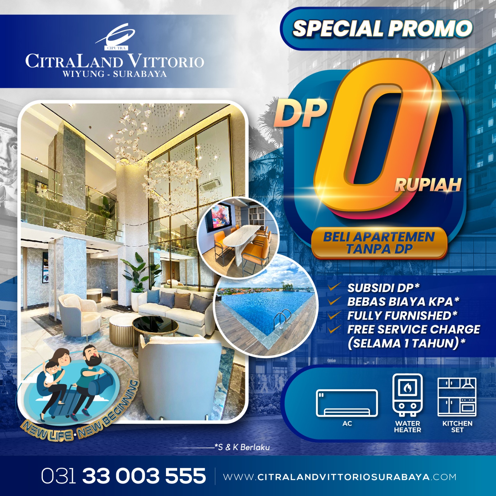 Dapatkan apartemen fully furnished 400 jt-an di Surabaya Barat tanpa bayar DP dan biaya KPA! Anda sudah bisa menikmati fasilitas lengkap mulai dari AC, water heater, smart home system, dan kitchen set.